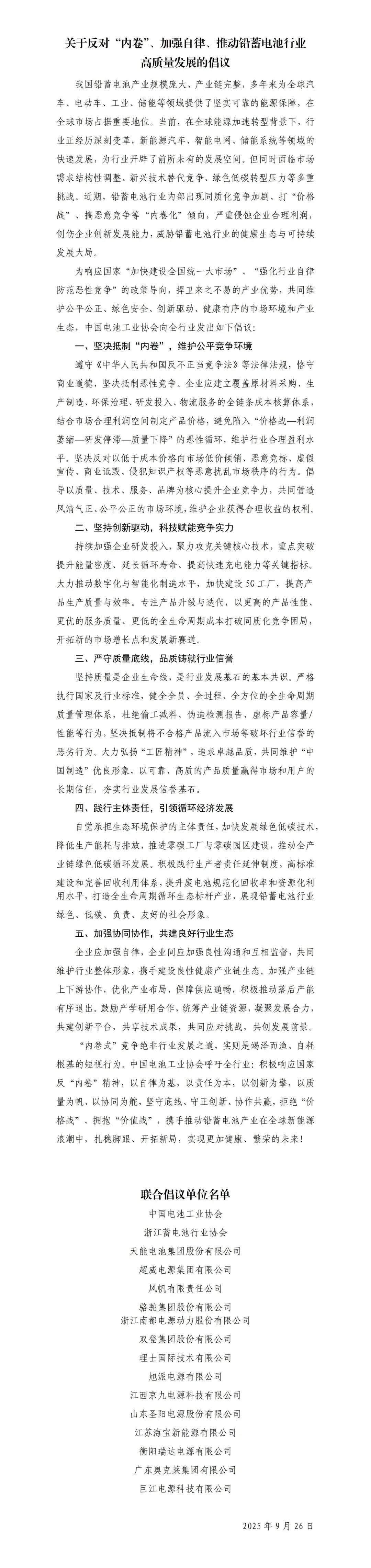 為積極響應(yīng)國家關(guān)于推動產(chǎn)業(yè)高質(zhì)量發(fā)展的號召,有效應(yīng)對行業(yè)當(dāng)前面臨的發(fā)展挑戰(zhàn),凝聚行業(yè)共識、破解發(fā)展難題,2025年9月26日,鉛蓄電池行業(yè)反內(nèi)卷工作會議順利召開。會議邀請了浙江蓄電池行業(yè)協(xié)會以及天能、超威、風(fēng)帆、駱駝、雙登、理士、旭派、南都、京九、圣陽、海寶、瑞達(dá)、奧克萊、巨江等國內(nèi)重點鉛蓄電池企業(yè)主要負(fù)責(zé)人,重點圍繞行業(yè)健康發(fā)展議題展開深入交流。中國電池工業(yè)協(xié)會理事長劉寶生、副理事長馬德軍參加會議,會議由中國電池工業(yè)協(xié)會副理事長兼執(zhí)行秘書長王建新主持。