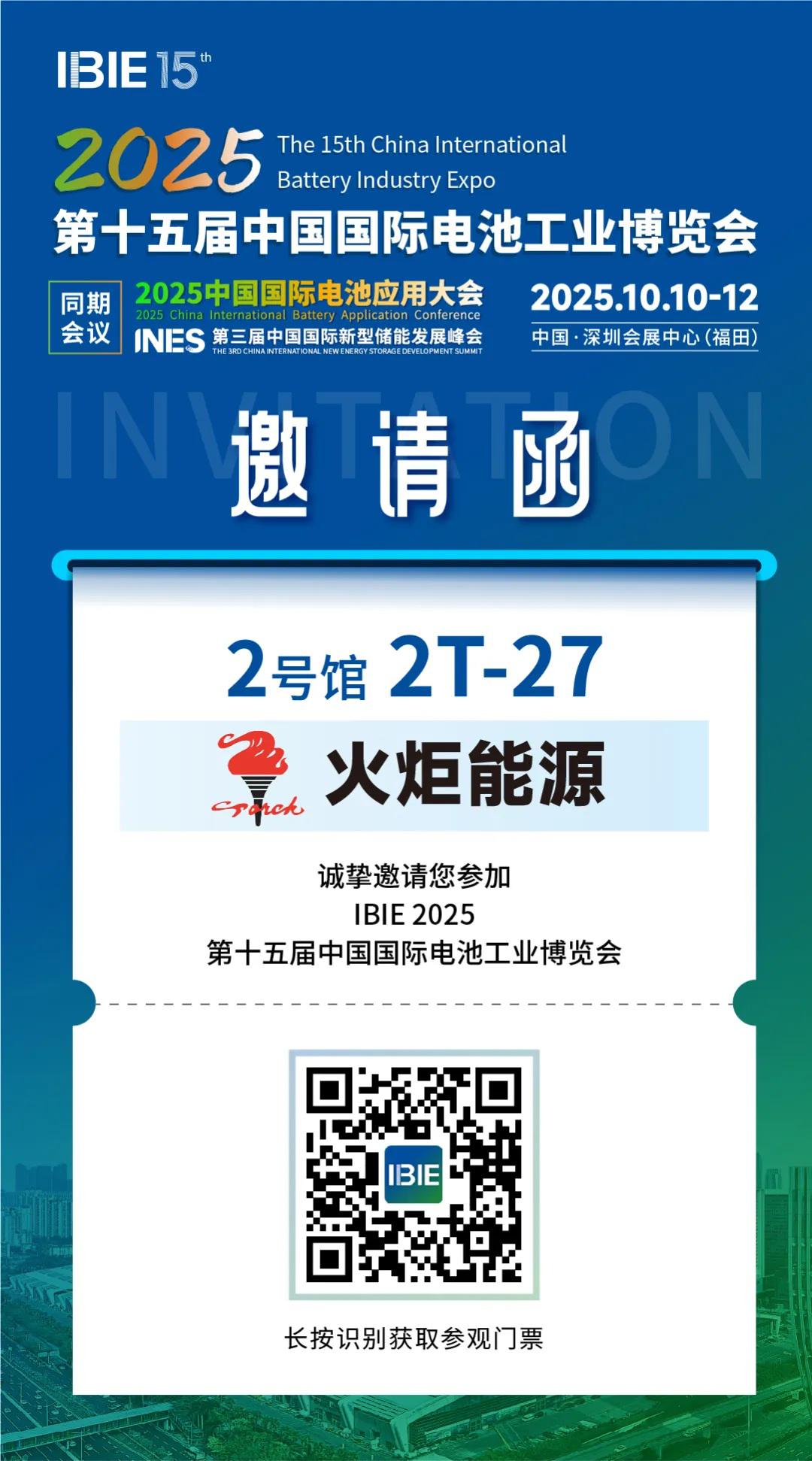 第十五屆中國國際電池工業(yè)博覽會(IBIE 2025)將于2025年10月10-12日在深圳福田會展中心舉辦。淄博火炬能源有限責(zé)任公司將精彩亮相第十五屆中國國際電池工業(yè)博覽會(IBIE 2025),展位位于2T-27。