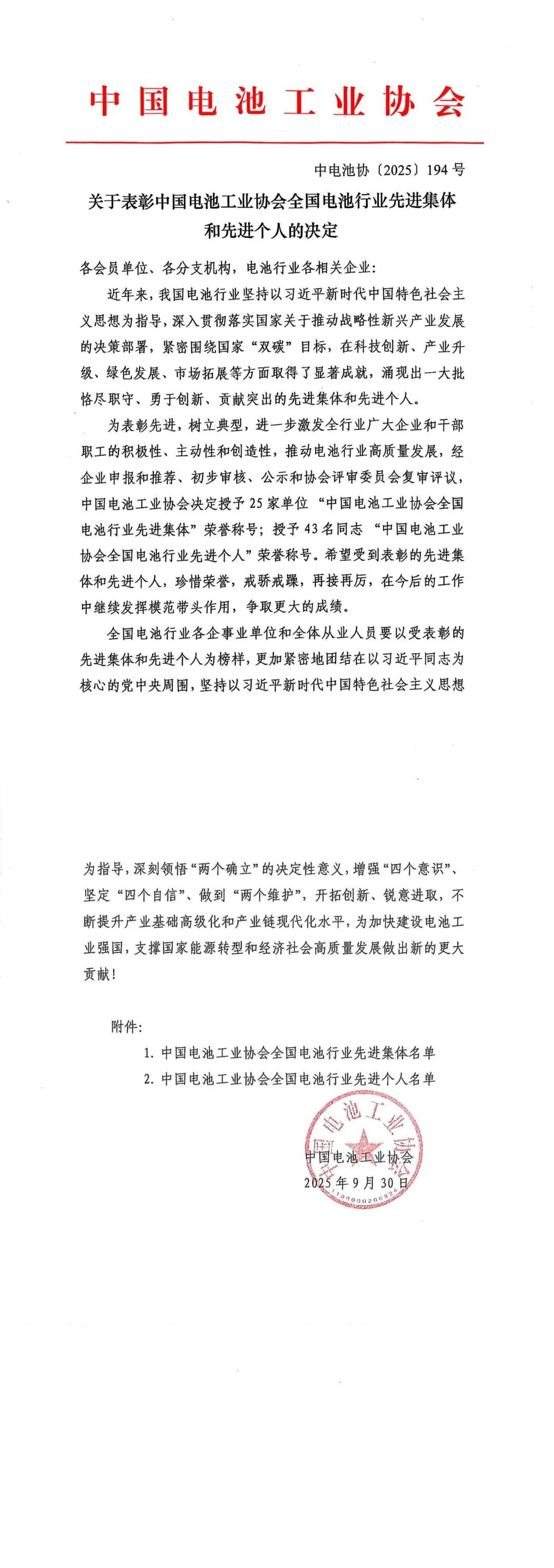 中國電池工業(yè)協(xié)會全國電池行業(yè)先進(jìn)集體