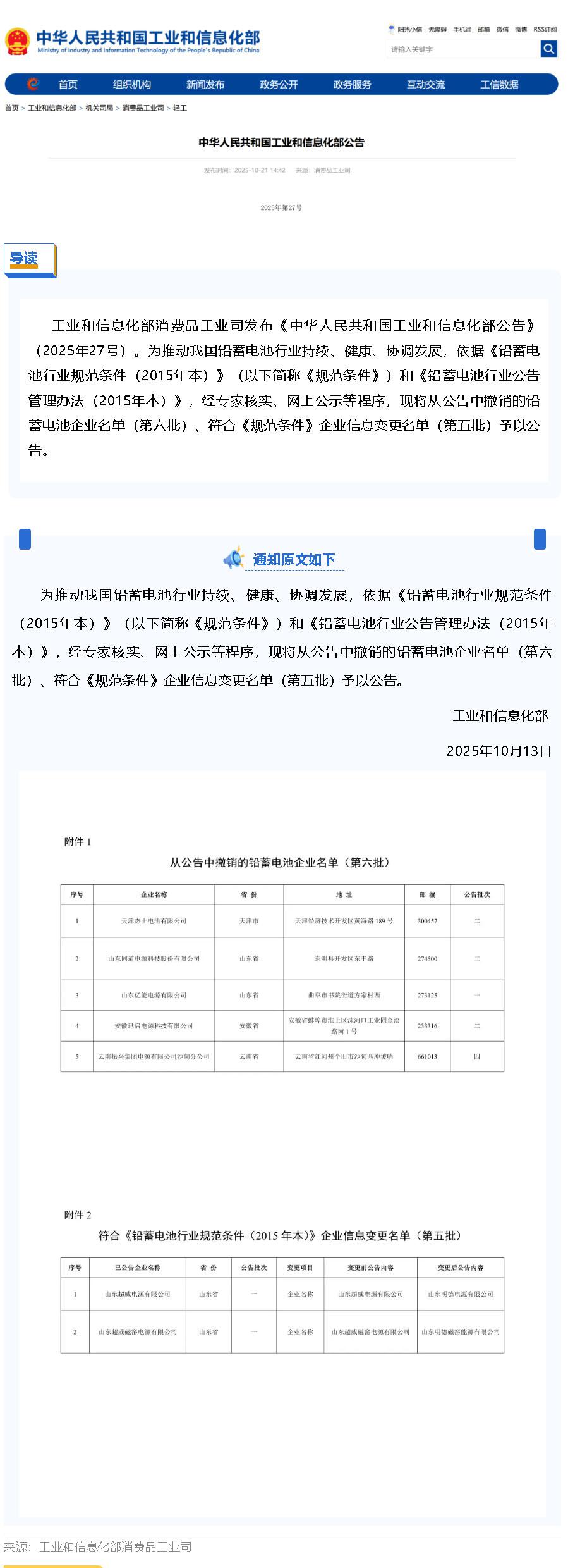 工業(yè)和信息化部發(fā)布關(guān)于對部分鉛蓄電池企業(yè)撤銷、信息變更的公告
